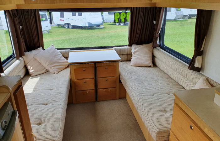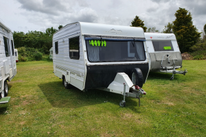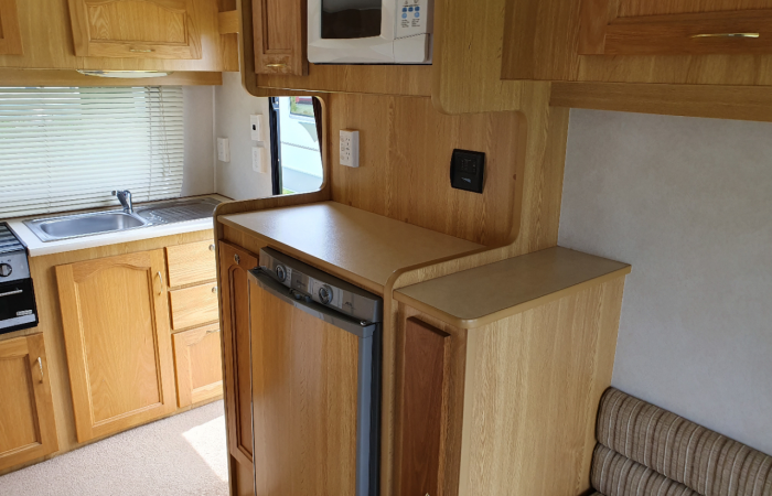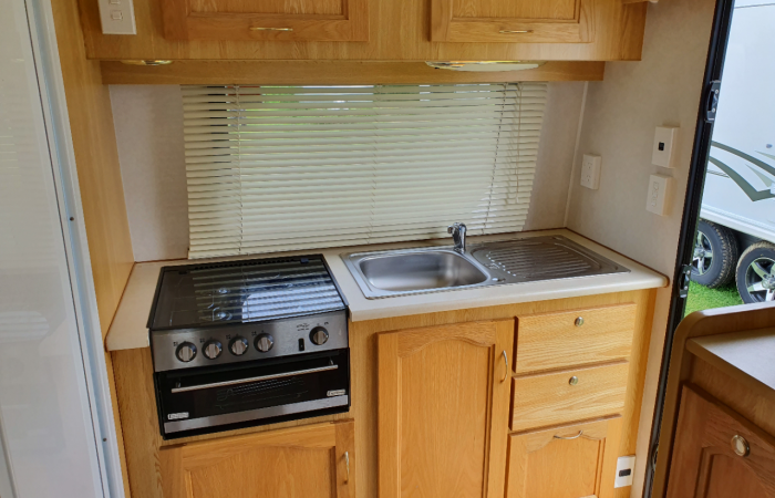 2 x single beds with extra length, full & half canvas awning, 82L fresh & 90L grey water tanks, tv & wind-up satellite dish, rear kitchen with gas hobs & grill.